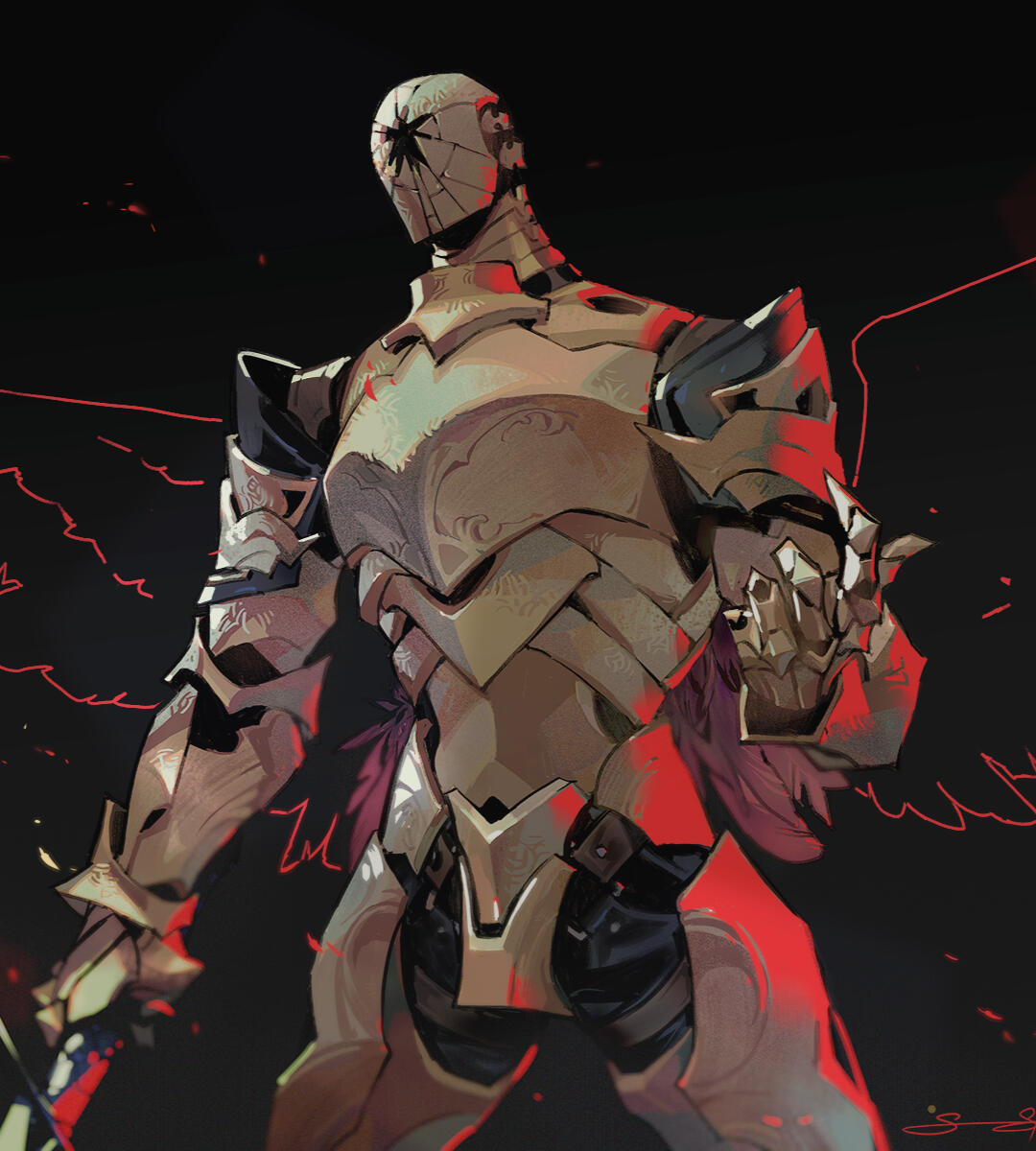 Standing at 8 fulms and sporting a distinctive shattered helm, Criticality has an imposing presence, even without the air of playful malice that he radiates. The armor exudes an effortless confidence, insufferably smug regardless of the situation.His voice echoing within a seemingly hollow armor, even harmless conversations may seem like you're making a deal with the devil, and he delights in unsettling or flustering others.It is not uncommon for the armor to say hello with a fight, even for those he's fond of. However if he finds you within the innermost halls of Amdapor, a place he devotedly haunts, it is a much less playful confrontation you will find.While Criticality is indeed voidsent, the living armor poses as man serving as a modest, albeit strange, bodyguard. When serving as said bodyguard he strives to be more or less well-behaved, but beneath his flippant sass there is a mystique about him, an ageless quality of a man who has seen too much to be entirely normal.